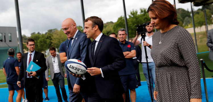 Emmanuel Macron avec le président de la Fédération française de rugby, Bernard Laporte et la ministre des Sports, Roxana Maracineanu,