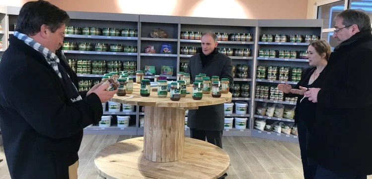 La visite de l’entreprise JEAN HERVÉ a été guidée et commentée par Mme Maia HERVÉ. Créée il y a plus de quarante ans, l’entreprise a construit une nouvelle unité de production à Boussac, en 2017 et ainsi créé sur place 11 emplois. Ce lundi 4, ouvrait dans le hall d’accueil de l’unité creusoise, une boutique d’entreprise ouverte au grand public. L’intégralité de la gamme des produits JEAN HERVÉ y est proposée. Ce spécialiste des produits alimentaires bio et haut de gamme élaborés à partir de fruits secs (noisette, amande, noix de cajou, cacao) s’est forgé en France et à l’étranger une solide réputation, exclusivement née du bouche-à-oreille. L’entreprise créée en 1976 par Jean HERVÉ, dont le siège social est à Clion, dans l’Indre, génère aujourd’hui 20 millions d’euros de chiffre d’affaires et emploie au total 48 personnes.
