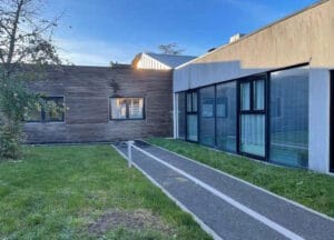 L’extérieur comprend huit places de parking à l’adresse rue Combeau et un cheminement piéton à mobilité douce partant de la place de la Fontaine atteignant l’arrière de l’Ehpad.