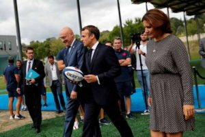 Emmanuel Macron avec le président de la Fédération française de rugby, Bernard Laporte et la ministre des Sports, Roxana Maracineanu,