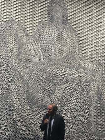 Thomas Bayrle a souhaité donner une puissance particulière à son œuvre, il a souhaité nous révéler à quel point la Première Guerre mondiale a été le moment où la révolution industrielle s’hybride avec l’art traditionnel de la guerre. Je le remercie d’être présent aujourd’hui et d’avoir bien voulu se prêter aux échanges concernant l’interprétation de l’œuvre avec les artisans et d’avoir partager son univers de création avec les élèves des collèges et lycées qui sont venus le rencontrer. Il convient d’ailleurs de souligner le travail de Romain Bonnot, professeur d’histoire-géographie détaché de l’Education nationale au bénéfice de la Cité, qui a mobilisé des élèves du Lycée Eugène Jamot qui ont suivi la réalisation de la tapisserie pendant 3 ans, de la seconde à la terminale.
