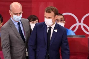 Jean-Michel Blanquer et Emmanuel Macron à Tokyo pour les JO, le 24 juillet. (Philippe Millereau/KMSP via AFP)